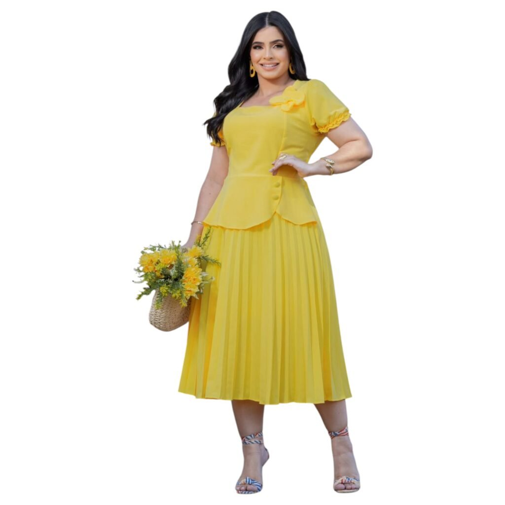 Vestido Moda Evangélica Detalhe Flor Babado Saia Plissada