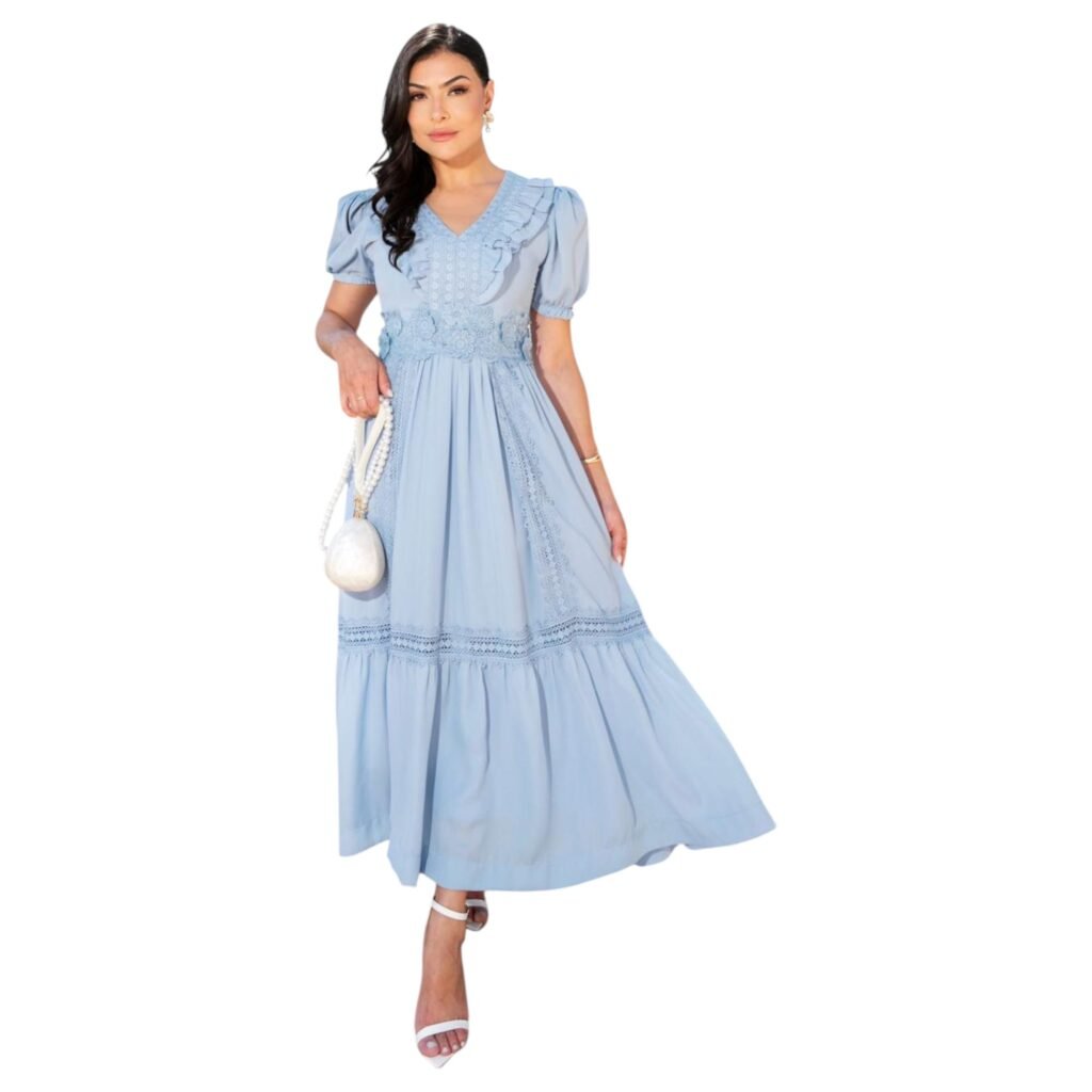 Vestido Moda Evangélica Mídi Detalhe Flor Bordado Manga