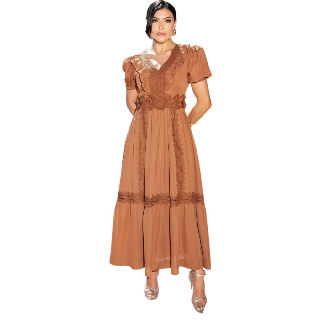 Vestido Moda Evangélica Max Mídi Godê Detalhe Manga Botões